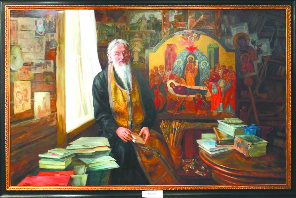 Огромная картина – портрет самого батюшки. Написала его ученица отца Рафаила, ярославская художница. У каждого в жизни есть учитель, духовный наставник, иными словами, тот человек, перед которым вы особо себя чувствуете. Кто угодно может сказать вам что угодно, вы согласны оказаться в неловкой ситуации перед всеми, но только не перед этим человеком. И вот духовное чадо пишет своего духовного отца, художника с мировым именем, гениального человека… Представляю себе, как у неё руки тряслись. И батюшка тоже понимает, что с ней происходит. Ей удалось показать самую главную черту батюшки – любовь. Вот в чём гениальность этой картины. Отец Рафаил сидит в своей комнате, «кельюшке», как он её называет, где всё лежит, как лежит, как это бывает у творческой личности, и ничего передвинуть нельзя... А в глазах такая любовь, такое тепло исходит от него: «Держись, всё будет хорошо». Вообще, «коронная» фраза отца Рафаила: «Ну, вы уж там, пожалуйста, держитесь. Всё будет». Многие его спрашивают: «Батюшка, а как будет-то?» – «А как Бог даст, так и будет».