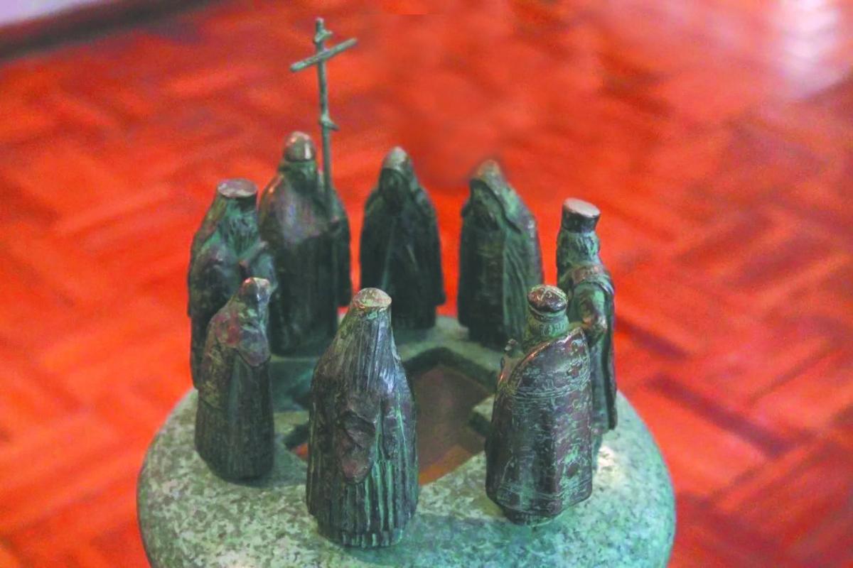 архиереи в полном облачении стоят, сомкнувшись, держа в руках Евангелия и потиры, а над их головами возвышаются кресты.