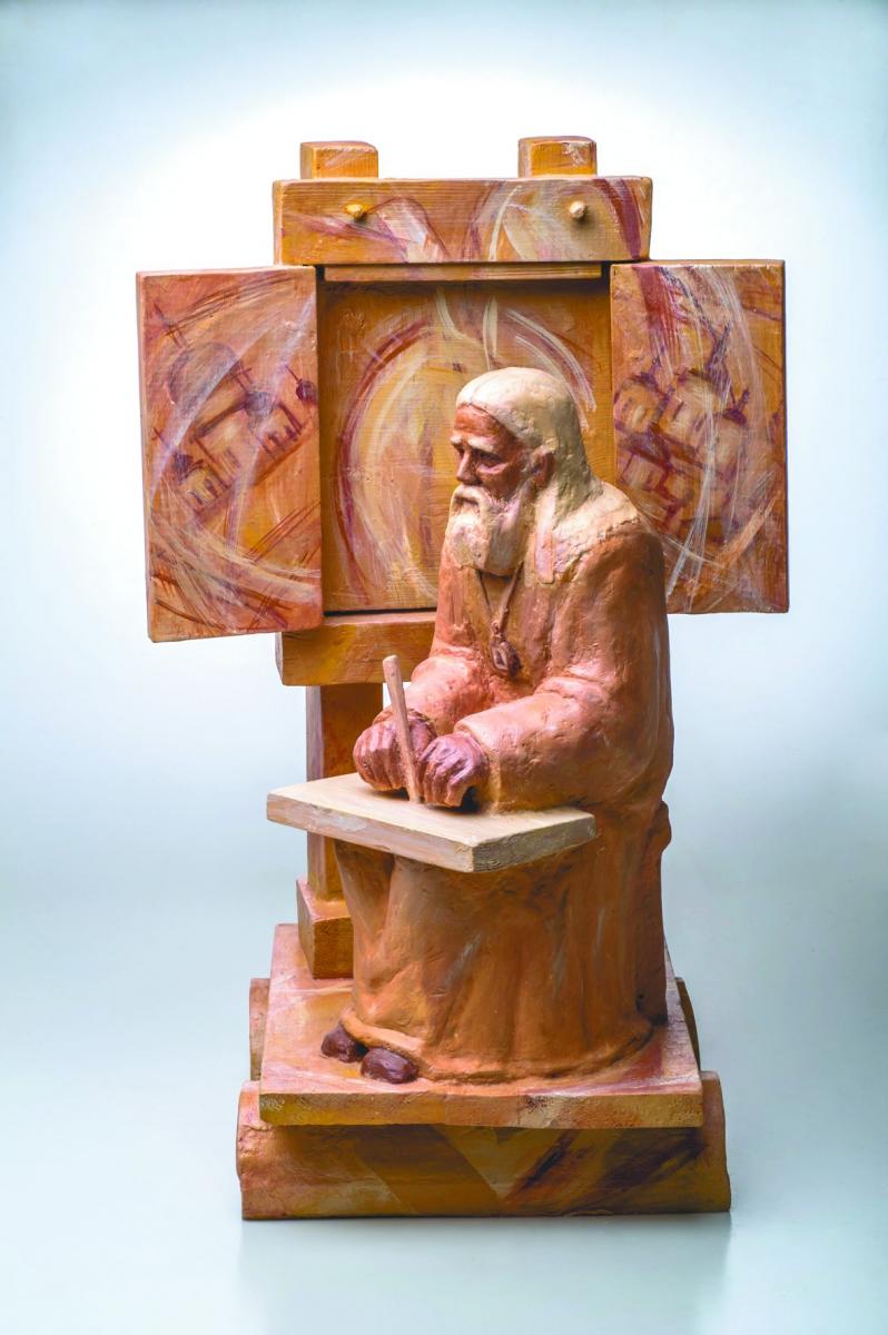 Работая в разных материалах (камень, дерево, глина), мастер находит для каждого решения образа свои объёмные композиции, неред-ко очень контрастные: от маленьких камерных фаянсовых работ – до брутальных рубленых скульптур из дерева. К последним можно отнести портреты русских писателей А.П. Чехова, В.Г. Распутина и философа Н.Ф. Фёдорова.