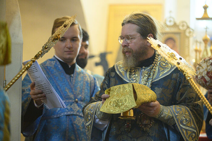 Его Высокопреосвященству сослужили игумен Петр (Васильев), настоятель единоверческого храма святителя Николы в Студенцах города Москвы; иеромонах Анатолий (Донцу), настоятель подворья Псково-Печерского монастыря в городе Пскове, диакон Александр Короплясов и диакон Антоний Кармазин.